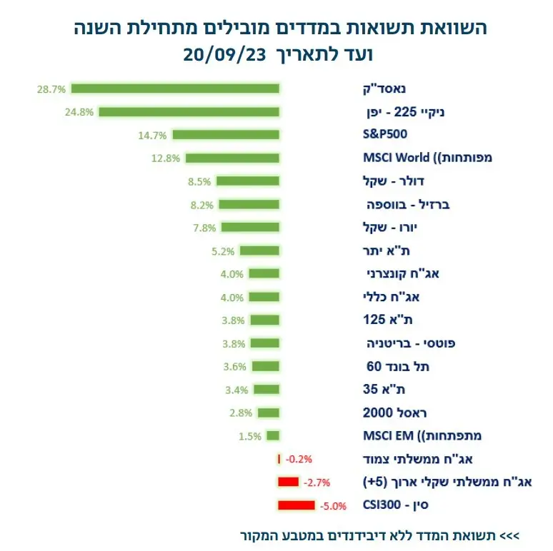 לאחרונה המומנטום הכלכלי דווקא מפתיע לטובה, כשבלטו למשל לטובה בספטמבר פרסומי המכירות הקמעונאיות בארה"ב, עם עליה של 0.6% לעומת צפי ל-0.1%, וסקר מנהלי הרכש בחברות השירותים (של ISM) שהפתיע ברמת התרחבות של 54.5 לעומת צפי ל-52.5. אומנם נתון האבטלה הפתיע לרעה, כשעלה מ-3.5% ל-3.8%, אך גם קובעי המדיניות בבנק הפדרלי וגם בממשל האמריקאי המעיטו בערכו. שרת האוצר האמריקאית ילן למשל אמרה שההתקררות בשוק העבודה בריאה ואיננה מאופיינת בפיטורים המוניים. על פניו נראה שגם בגזרת האינפלציה התנאים טובים לשוקי המניות, כשהיא המשיכה ברוב המדינות להתקרר בספטמבר, ושרת האוצר יילן אף ציינה בנאומה החודש את התקררות האינפלציה במדינות מפותחות רבות. אך שוק ההון לא מגיב לקצב האינפלציה עצמו אלא לקצב לעומת הציפיות המוקדמות שהיו לגביו ובנקודה הזאת נרשמה אכזבה בספטמבר. ההפתעות האמורות לרעה השתקפו ב"מדד הפתעות האינפלציה של סיטי", שחזר לעלות בספטמבר, לראשונה מזה 5 חודשים. הפתעות אינפלציה בולטות נרשמו למשל בארה"ב (3.7% לעומת צפי ל-3.6%), קנדה (4.0%, לעומת צפי ל-3.8%), צרפת (4.9% לעומת צפי ל-4.8%) ואפילו ישראל (4.1%, כשהצפי היה ל-4.0%). רוב הפתעות האינפלציה הגיעו כנראה מהחזרה המפתיעה של מחירי האנרגיה לעליה באוגוסט, עליה שנמשכה גם בספטמבר. העליה במחיר הנפט עשויה היתה להיתפס כחיובית אם היתה נובעת ברובה מהתעוררות מחודשת של הביקושים בעולם, אך היא הוסברה ברובה בזעזועים בהיצע, כשבלטו קיצוצי תפוקה של סעודיה ורוסיה. למעשה בצד הביקוש החששות דווקא גברו, בעיקר מצד סין. שרת האוצר יילן התייחסה אליה ואמרה החודש שהיא רואה בעיות בסין הן בטווח הקצר והן בטווח הארוך, בעיות שיתכן ואף תהיה להן זליגה מסוימת לארה"ב. בהקשר הזה אגב הנשיא האמריקאי ביידן הפתיע כשהסביר שלארה"ב אין כוונה להיפרד מסין אלא להסיר את הסיכונים הכרוכים בפעילות מולה. אם נחזור לסוגיית האינפלציה מול התחדשות ההתייקרות במחירי האנרגיה היו בפרסומי האינפלציה גם כמה חדשות טובות ובראשן שקצב עליית מחירי הדיור (שכירות) ממשיך להתמתן (אף שהוא עדיין מהיר). בישראל לדוגמה השכירות התמתנה משינוי שנתי של 7.5% במאי ל-6.2% באוגוסט. סביר להניח שככל ובחודשים הבאים המדדים הגבוהים של 2022 ותחילת 2023 יצאו מהחישוב נתחיל לראות אחרי החגים האזרחיים, כלומר בתחילת 2024 את האינפלציה יורדת עוד מדרגה ולראשונה מתחילה להתבסס סביב מרכז היעד שלה, מה שיאפשר גם לבנקים המרכזיים להתחיל לדבר על הפחתות. רק קחו בחשבון שבין תחילת הדיבורים להכנת השוק להפחתה ועד למעשים יעברו כנראה כמה חודשים נכבדים. השוק מעריך כעת שהפחתות הריבית בארה"ב יתחילו רק ברבעון השלישי.