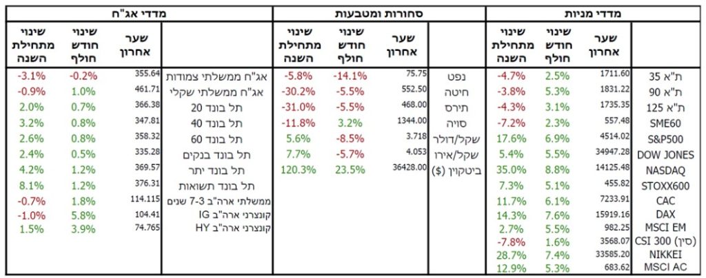 תשומת הלב של המשקיעים ברחבי העולם הופנתה במהלך התקופה הנסקרת להצטברות הסימנים להאטה הגלובאלית ההולכת ומתקרבת. זאת, לצד נתוני אינפלציה שהפתיעו לטובה, הביאו את תשואות האג"ח בעולם לרדת בחדות. הירידה בתשואות האג"ח תמכה בשוקי המניות שרשמו עליות שערים יפות ברוב המדדים המובילים. בישראל, לצד הרוח הגבית מהעולם, אי הוודאות הנובעת מפרוץ המלחמה התבהרה במקצת, מה שתמך גם בשווקים המקומיים. בהתאם, שער החליפין של השקל מול הדולר ירד לרמה הנמוכה מרמתו ערב המלחמה.
