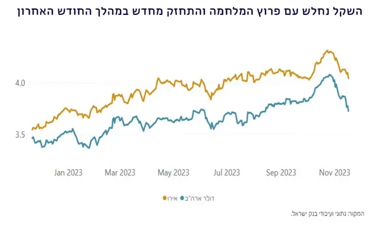 השפעות המלחמה על הכלכלה הישראל ועל השווקים הלכו והתבהרו במהלך התקופה נסקרת באופן שהיטיב עם המשקיעים. מגמה זו מעלה כמובן את השאלה הברורה: כיצד ייתכן שבזמן מלחמה קשה מול החמאס מדדי המניות והאג"ח בישראל עולים והשקל מתחזק מעבר לרמתו ערב המלחמה? התשובה לכך נעוצה בעובדה שהשווקים הפיננסיים אינם פועלים רק על סמך מידע קיים אלא גם ואולי בעיקר על סמך ציפיות לעתיד. לכן, אם בשבועות הראשונים של המלחמה השווקים חששו מהתלקחות של זירות מלחמה נוספות (בצפון וביו"ש) הרי שההסתברות לתרחיש זה, גם אם לא נעלמה לגמרי, בהחלט ירדה ככל שהזמן חלף וזירות אלו לא התלקחו. בנוסף, בשוק המט"ח התחזקות השקל מעבר לרמתו לפני המלחמה עשויה להעיד שהמשקיעים מעריכים ככל הנראה שהרפורמה המשפטית שהובילה לפיחות יתר של כ-10%-15% בערכו של השקל ירדה לעת עתה מסדר היום הציבורי. לכן ההשוואה הנכונה על מנת להבין את השפעת המלחמה על שער החליפין היא לרמתו בתחילת השנה (3.4-3.5 שקל לדולר) ולאו דוקא לפני בתחילת אוקטובר.